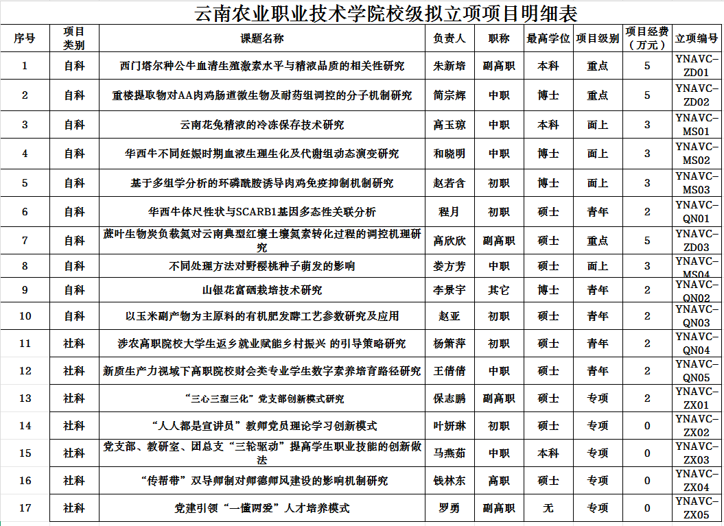2025年云南农业职业技术学院博士专项立项项目一览表