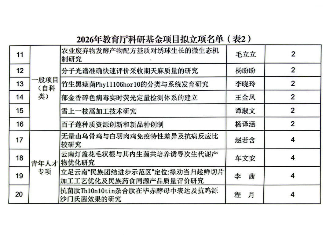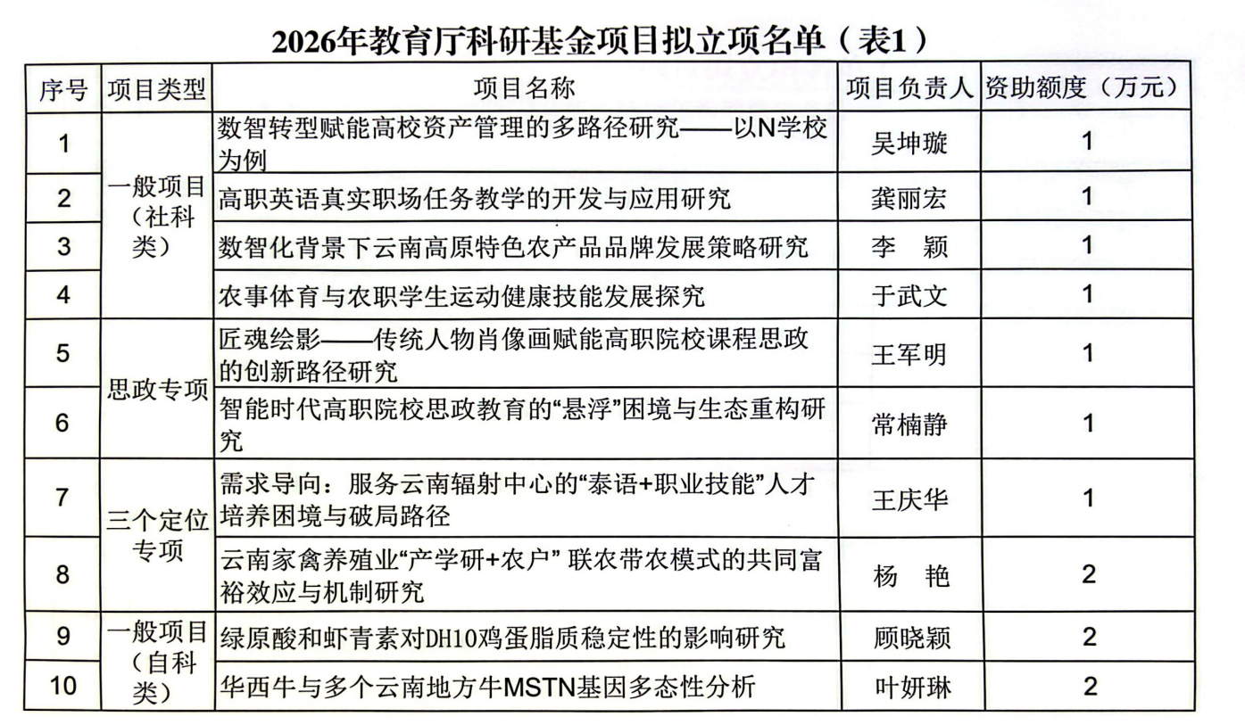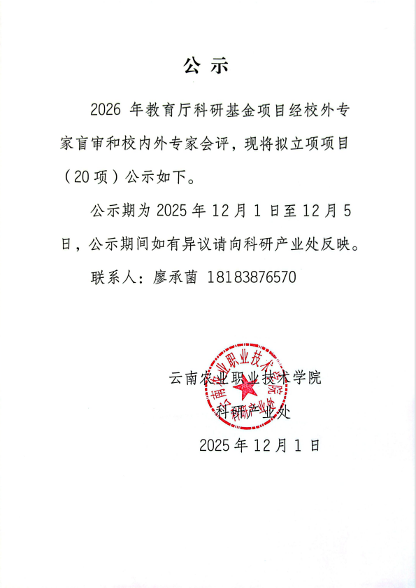 2026年度教育厅科研基金项目拟立项家盲审和校内外专家会评,现将拟立项项目公示期为2025年12月1日至12月5日,公示期间如有异议请向科研产业处反映。