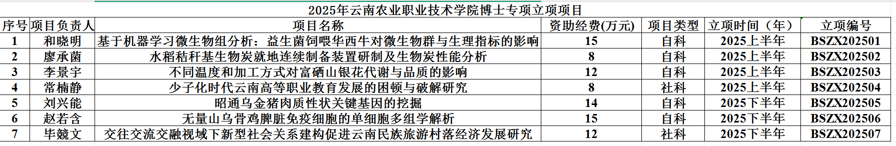 2025年云南农业职业技术学院博士专项立项项目一览表